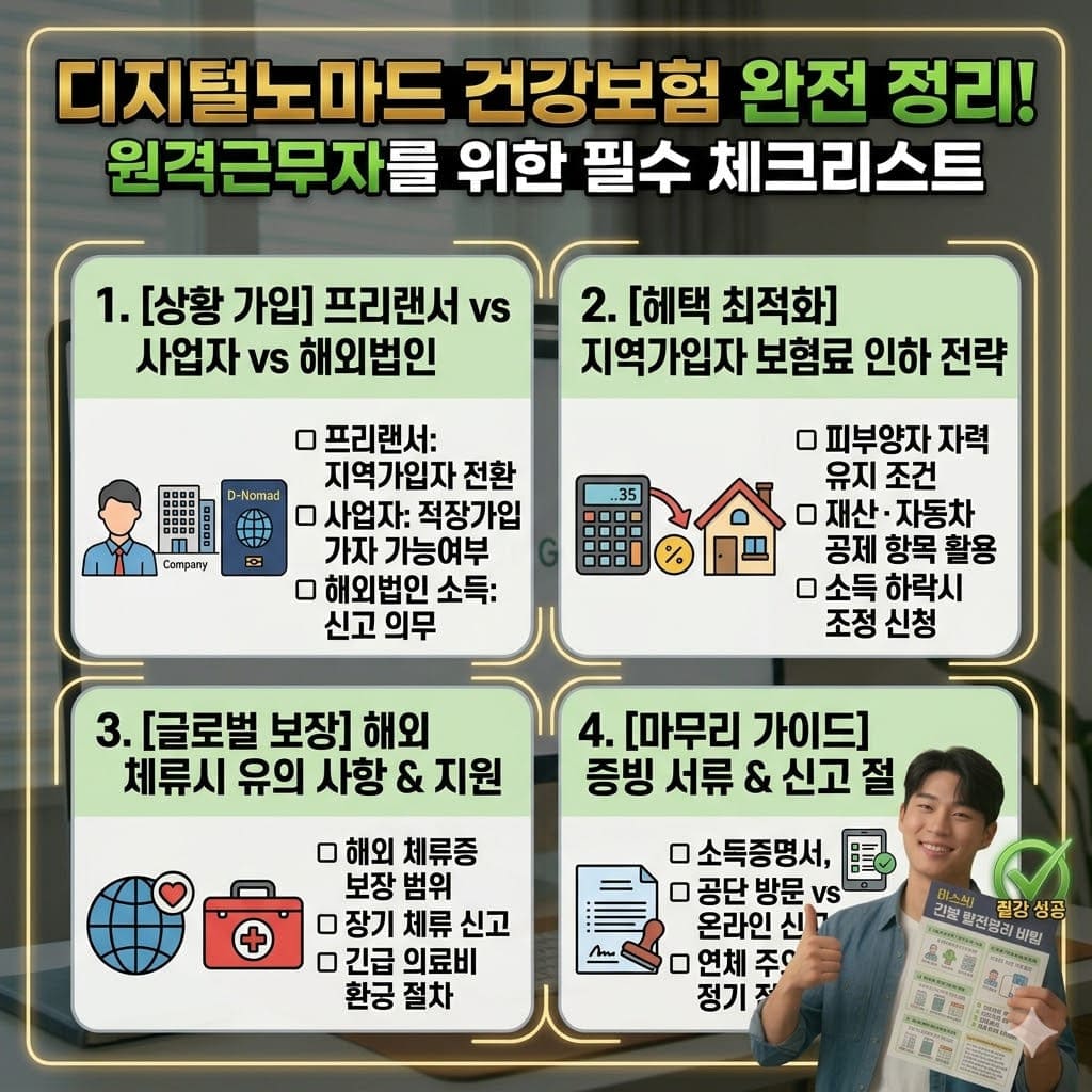 디지털노마드 건강보험은 "어느 하나가 정답"이 아닙니다. 체류 기간, 방문 국가, 기존 질환 여부, 한국 복귀 빈도에 따라 최적 조합이 달라집니다. 이 글의 로드맵을 본인 상황에 대입해 가장 비용 효율적인 구조를 설계하세요.