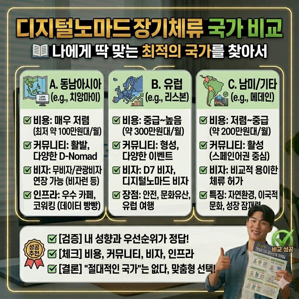 📖 "어느 나라로 가야 하지?" — 디지털노마드를 시작하면 가장 먼저 부딪히는 질문입니다. 비자 조건, 물가, 인터넷 속도, 생활 환경이 나라마다 완전히 다르고, 잘못 선택하면 3개월 만에 짐 싸야 하는 상황이 생깁니다.
