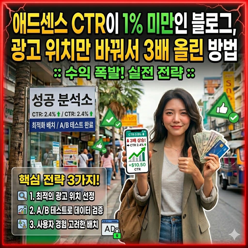 알고 보니 문제는 광고 위치였습니다. 헤더·사이드바·푸터에만 광고를 뒀던 배치를 제목 직하단·본문 중간·결론 직전 3곳으로 옮겼더니, 트래픽 변화 없이 CTR이 1.3%까지 올라갔습니다.