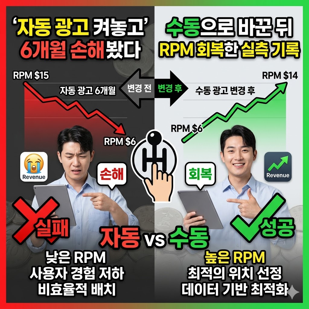 수동 광고로 전환 후 직접 위치를 잡기 시작했더니, 같은 트래픽에서 RPM이 40% 이상 올랐습니다. 단, 자동 광고가 무조건 나쁜 것도 아닙니다. 블로그 상황에 따라 정답이 다릅니다. 6개월 실측 비교 데이터를 공개합니다.