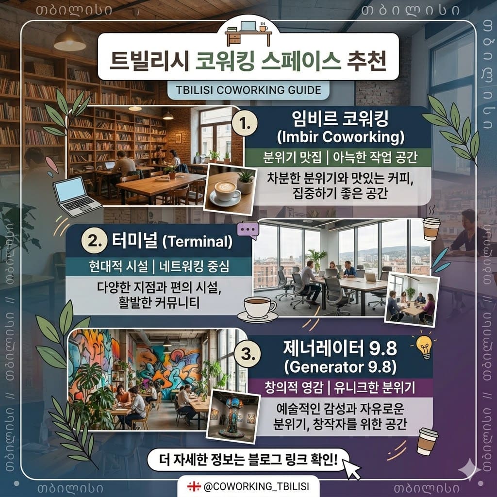 트빌리시 코워킹은 서울 강남 코워킹보다 훨씬 저렴하면서도 인터넷 속도와 시설은 꽤 수준급입니다. 월 6만 원대부터 시작하는 Impact Hub부터, 어느 동네에서나 15분 내 접근 가능한 Terminal까지 — 본인 숙소와 업무 스타일에 맞는 곳을 하나 잡아두면 트빌리시 생활이 훨씬 안정됩니다.