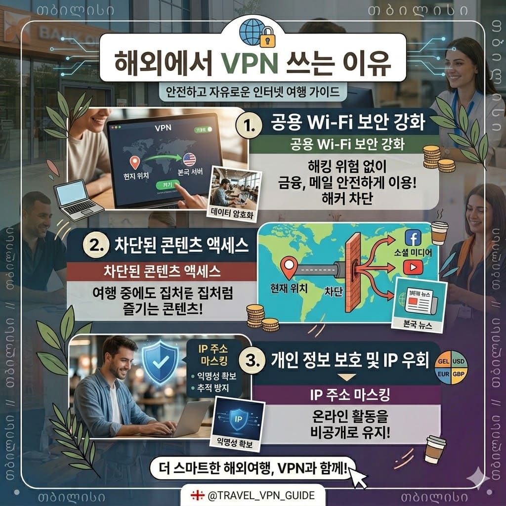 조지아에서 홈택스에 접속하려고 했더니 "해외에서의 접속이 차단됐습니다"라는 메시지가 떴습니다. VPN을 켜고 한국 서버를 선택하자 바로 접속됐습니다. 또 코워킹 공용 와이파이를 쓸 때는 클라이언트에게 보내는 계약서나 파일을 전송할 때 VPN을 항상 켭니다. 같은 네트워크에 누가 연결돼 있는지 모르니까요.